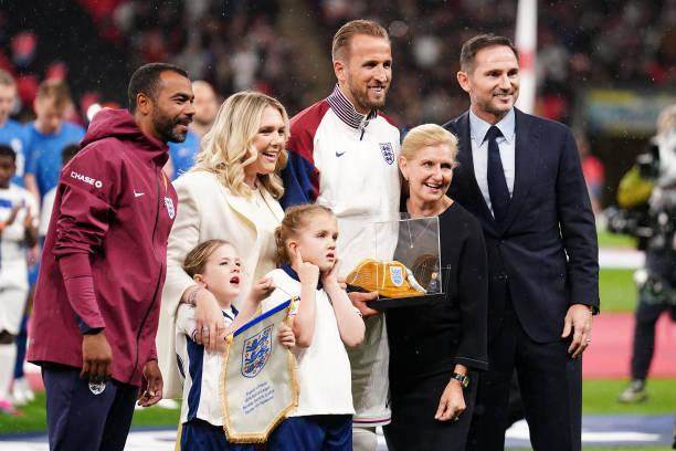 和主帅前景未定的卡斯利相比,当晚的凯恩则更像是场上的真正主角,为了庆祝自己在国家队的百场里程碑,他穿着一双打眼的金色球靴昂首登场,并在赛前从名宿兰帕德手中接过了有着特殊意义的百场金色纪念帽。BBC记者伊恩·丹尼斯透露,凯恩其实是在赛前最后一刻才确认将在这场比赛迎来自己的百场里程碑:“我和凯恩上周五在都柏林球队下榻的酒店聊过,他当时说他可能要准备在10月的国际比赛日迎来自己的百场庆典。因为他不确定对阵芬兰的比赛是否能首发出场,事实上他的家人直到周一也都还在慕尼黑等待消息,比赛日当天他的妻子和几个孩子才启程前往温布利,他的两个孩子还作为球童在球员通道和自己的爸爸共同入场。”